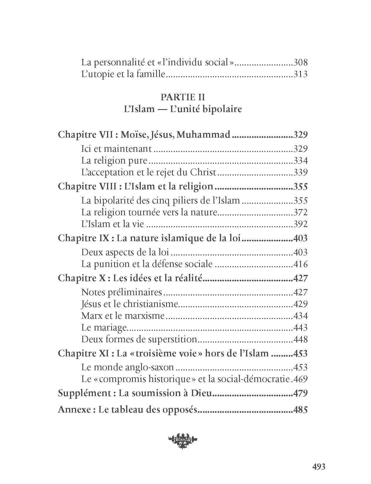 À l'inverse, l'Islam, par son essence intégrale, embrasse pleinement la nature de l'Homme dans toute sa bipolarité et sous tous ses aspects: la conscience et la matière, l'âme et le corps, la spiritualité et la nature, la pensée et la pratique, la culture et la civilisation, ce monde et l'autre. Par cette synthèse intellectuelle et concrète du meilleur des deux traditions rivales, donc, l'Islam sublime les oppositions et s'avère la meilleure réponse à cette dualité humaine innée - la seule conception à même de résoudre toutes les contradictions qui forment la base philosophique de la crise morale et culturelle du monde moderne.