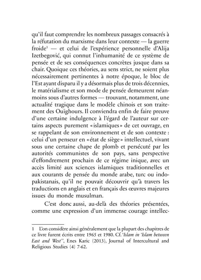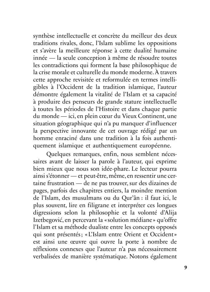 Si Alija Izetbegović y éblouit par sa maîtrise impressionnante de tous les sujets abordés, au-delà de l'érudition incontestable de l'auteur, c'est avant tout une thèse centrale qui est ici défendue dans cette approche revisitée et reformulée en termes intelligibles à l'Occident de la tradition islamique : celle de l'Islam en tant que « voie médiane » entre les deux visions du monde tout à fait distinctes que sont la religion pure et le matérialisme, qui n'offrent que des réponses partielles aux grandes questions de la vie et de l'existence.