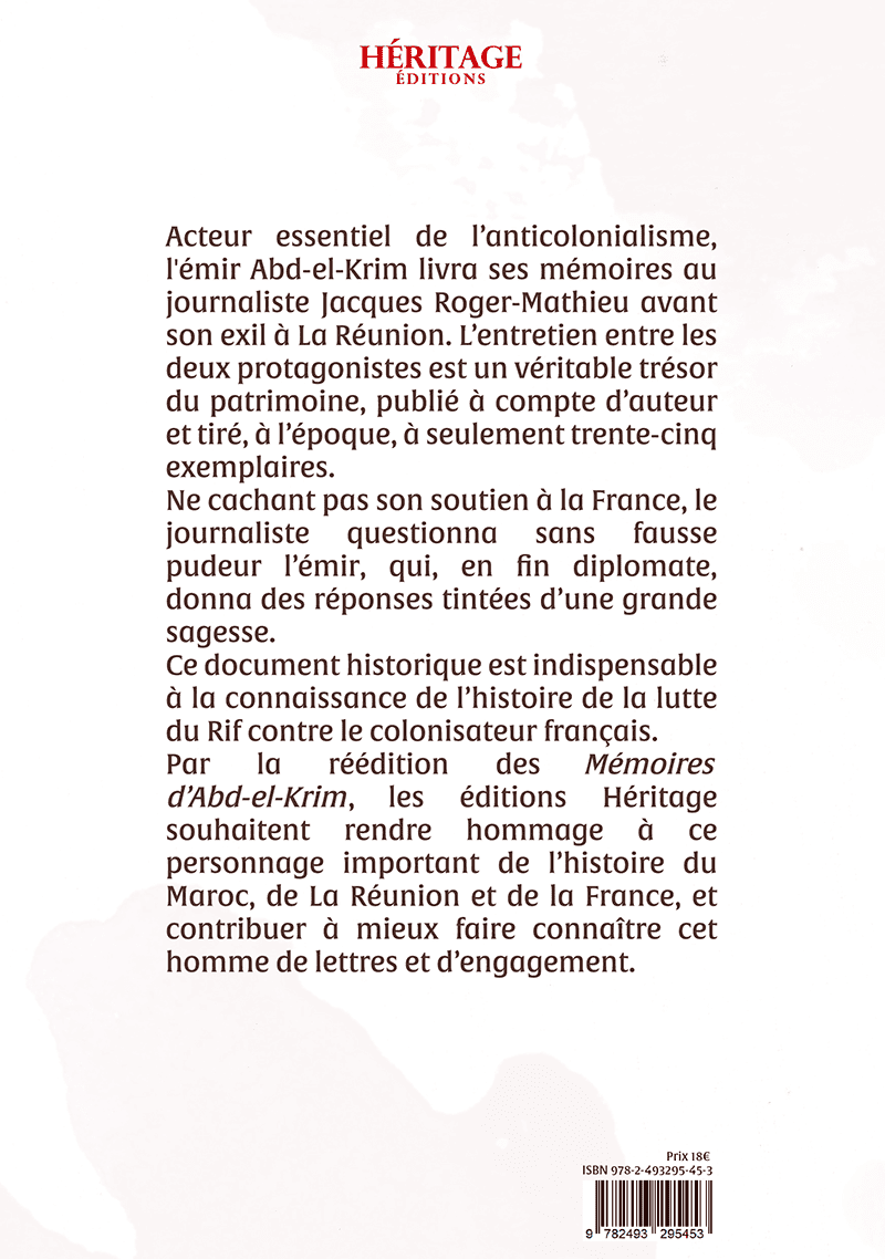 Ce document historique est indispensable à la connaissance de l'histoire de la lutte du Rif contre le colonisateur français. Par la réédition des Mémoires d'Abd-el-Krim, les éditions Héritage souhaitent rendre hommage à ce personnage important de l'histoire du Maroc, de La Réunion et de la France, et contribuer à mieux faire connaître cet homme de lettres et d'engagement.