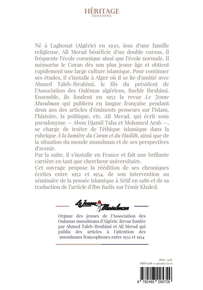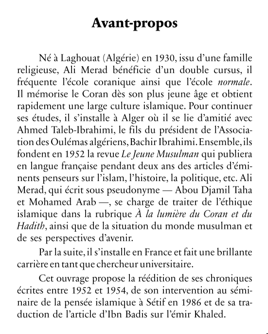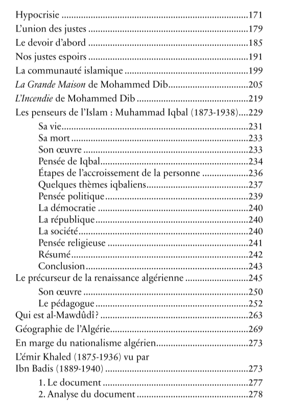 Cet ouvrage propose la réédition de ses chroniques écrites entre 1952 et 1954. de son intervention au séminaire de la pensée islamique à Sétif en 1986 et de sa traduction de l'article d'Ibn Badis sur l'émir Khaled.