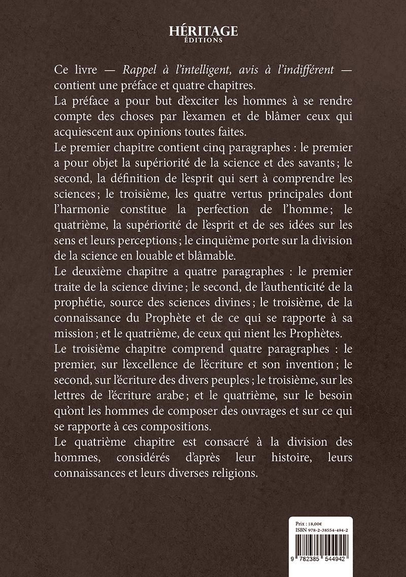Ce livre — Rappel à l’intelligent, avis à l’indifférent — contient une préface et quatre chapitres. La préface a pour but d’inciter les hommes à se rendre compte des choses par l’examen et de blâmer ceux qui acquiescent aux opinions toutes faites.