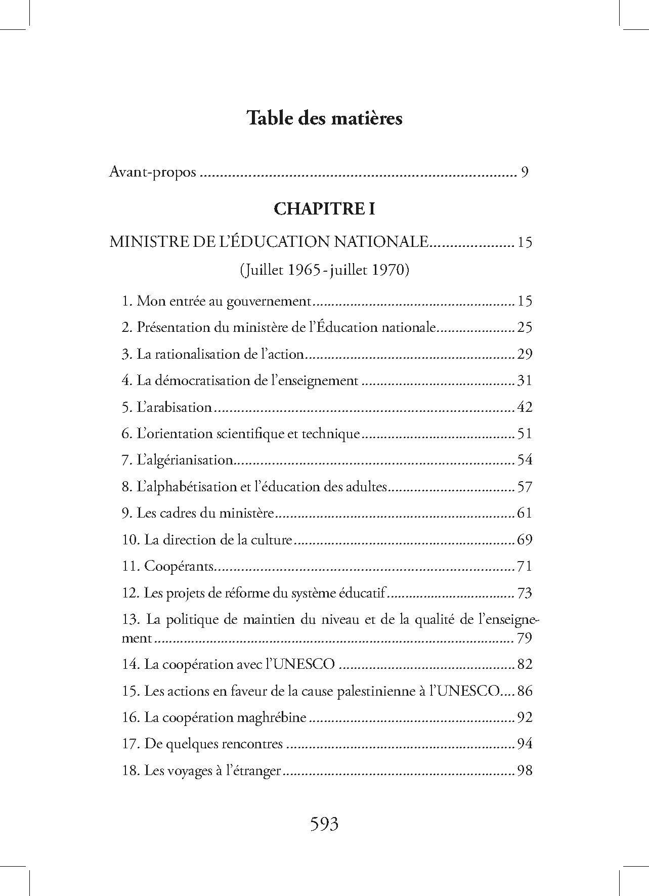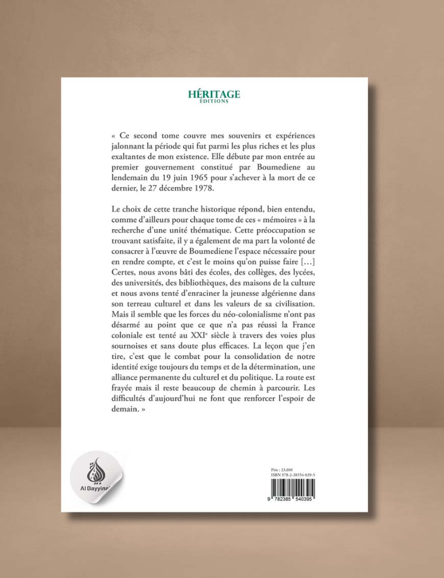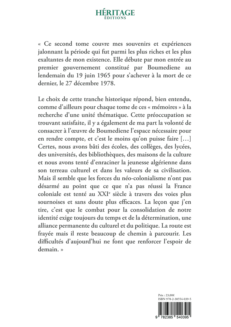 « Ce second tome couvre mes souvenirs et expériences jalonnant la période qui fut parmi les plus riches et les plus exaltantes de mon existence. Elle débute par mon entrée au premier gouvernement constitué par Boumediene au lendemain du 19 juin 1965 pour s’achever à la mort de ce dernier, le 27 décembre 1978.