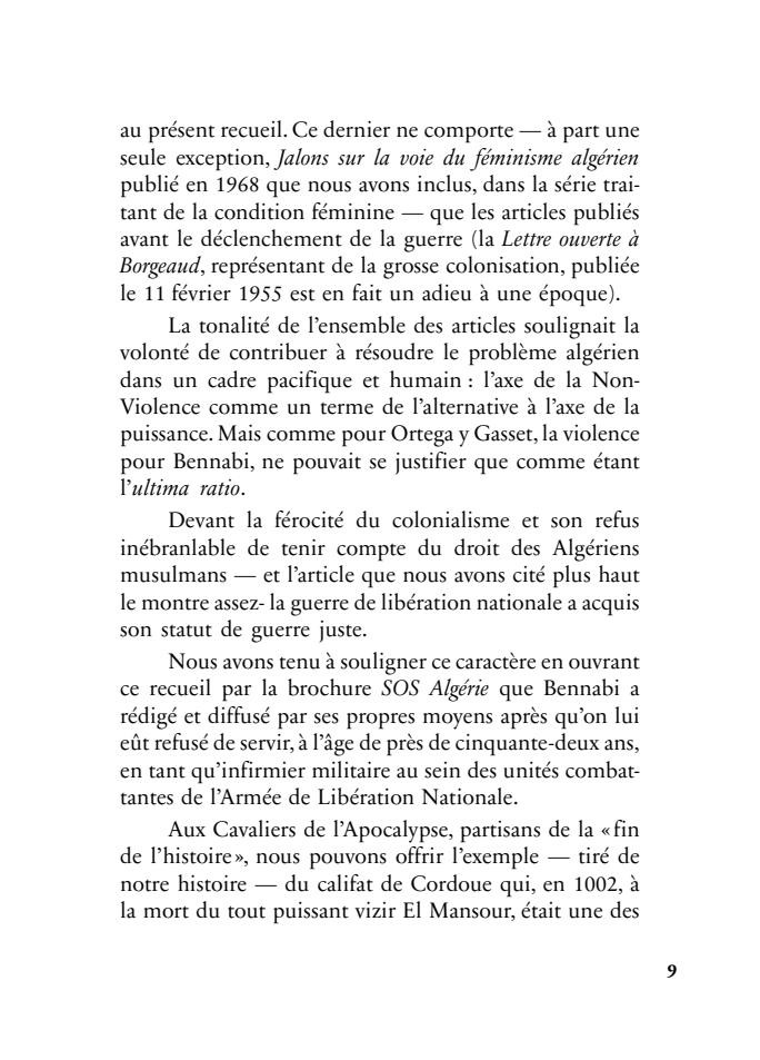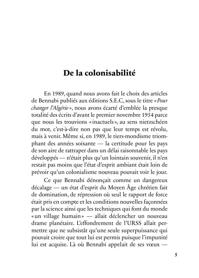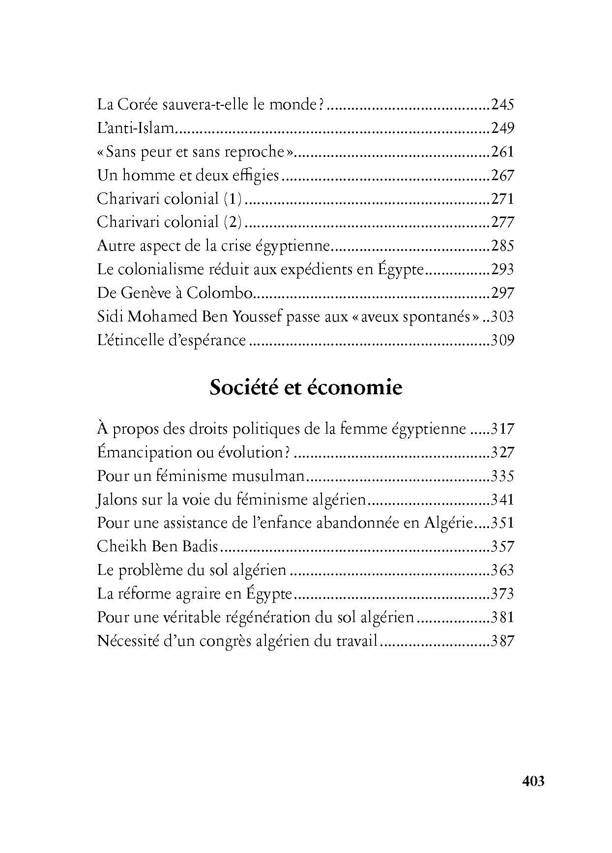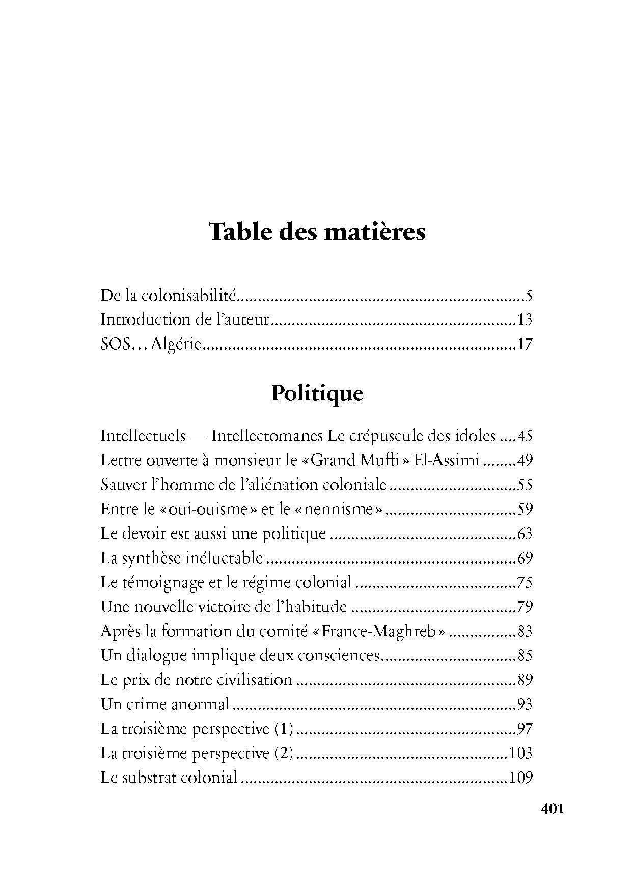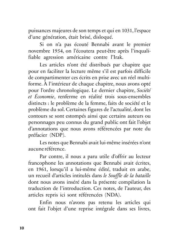 Nous voyons se déployer dans ces pages une pensée en action qui touche tous les aspects de la société. Le « médecin de la civilisation », sublime expression forgée par Nietzsche, le promoteur de cet art nouveau nommé par notre auteur le Renouvellement de l'alliance, c'est-à-dire le recyclage d'une civilisation, nous montre comment faire face aux multiples défis d'une société voulant se réinsérer dans l'histoire. Il serait vain de chercher dans les écrits de Bennabi une quelconque doctrine économique ou un système politique particulier, car la pensée de notre auteur a pour ambition d'aménager le sol de sorte que la construction sociétale, dans ses formes politique, économique, sociale, culturelle et ses liens avec les autres, soit solide. Notre penseur nous offre une vision et des outils de réflexion pour comprendre le monde et les enjeux sociétaux. Il balise la voie en dénonçant toutes les illusions mortelles comme la boulitique, autre nom de la démagogie qui n'a rien à voir avec la politique dont il nous dresse la configuration dans plusieurs articles. Il met en garde contre toute panacée qui nous soulage de tous efforts, comme l’économisme où tous les problèmes sont ramenés uniquement à leur dimension économique.