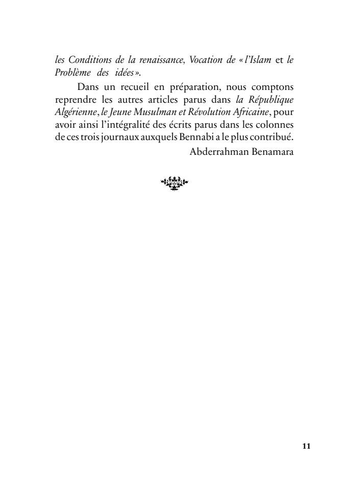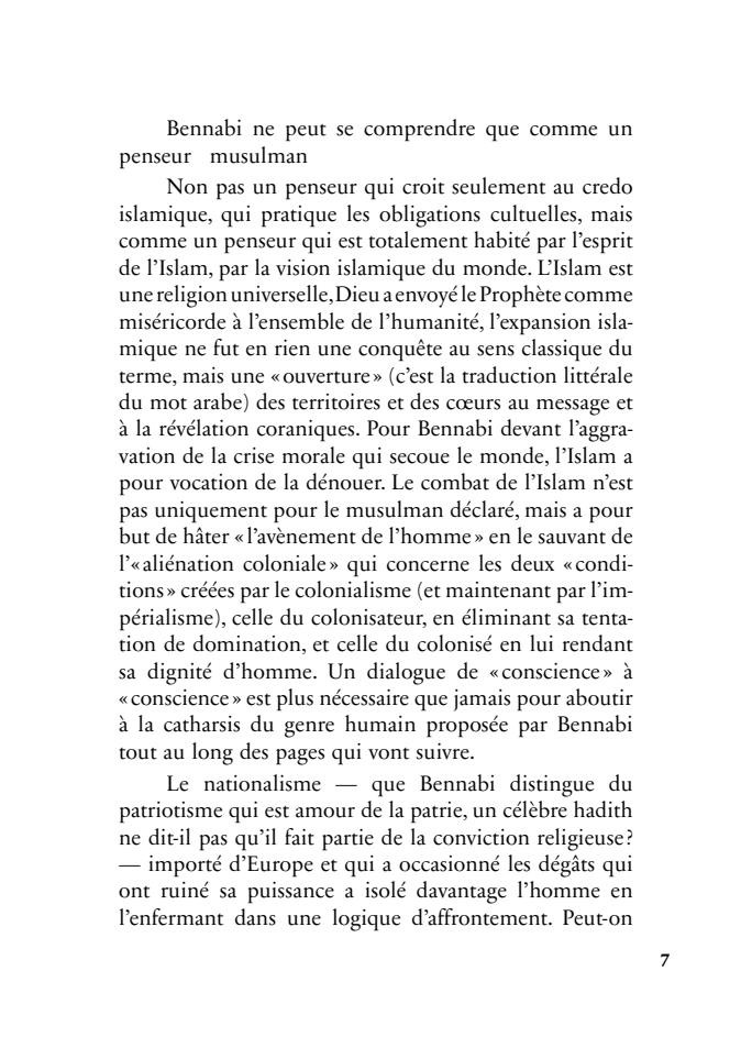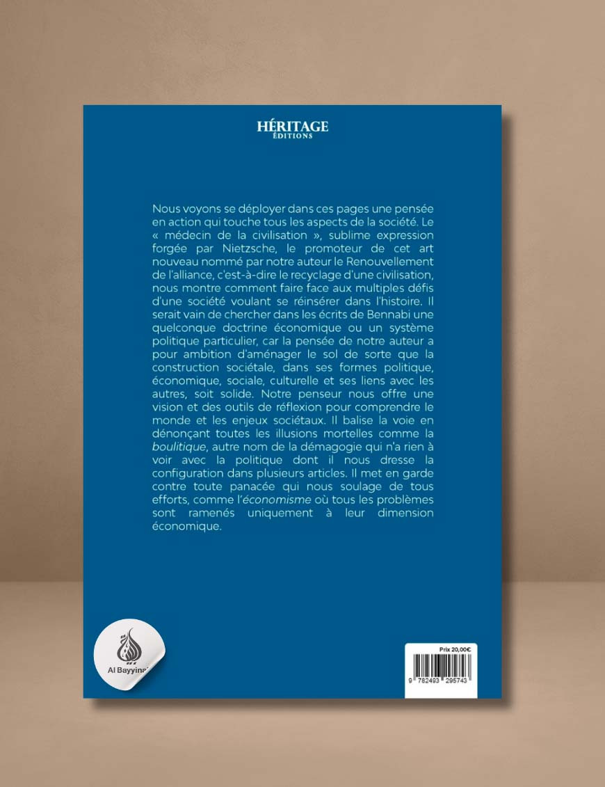 Nous voyons se déployer dans ces pages une pensée en action qui touche tous les aspects de la société. Le « médecin de la civilisation », sublime expression forgée par Nietzsche, le promoteur de cet art nouveau nommé par notre auteur le Renouvellement de l'alliance, c'est-à-dire le recyclage d'une civilisation, nous montre comment faire face aux multiples défis d'une société voulant se réinsérer dans l'histoire. Il serait vain de chercher dans les écrits de Bennabi une quelconque doctrine économique ou un système politique particulier, car la pensée de notre auteur a pour ambition d'aménager le sol de sorte que la construction sociétale, dans ses formes politique, économique, sociale, culturelle et ses liens avec les autres, soit solide.