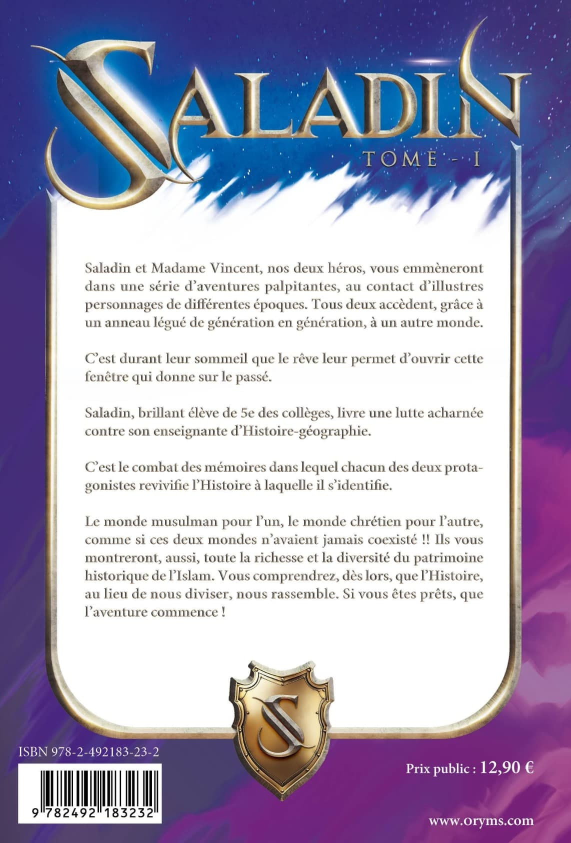 Saladin et Madame Vincent, nos deux héros, vous emmèneront, dans une série d’aventures palpitantes, au contact d’illustres personnages de différentes époques. Tous deux accèdent, grâce à un anneau magique légué de génération en génération, à un autre monde. C’est durant leur sommeil que le rêve leur permet d’ouvrir cette fenêtre qui donne sur le passé. Saladin, brillant élève de 5e des collèges, livre une lutte acharnée contre son enseignante d’Histoire-géographie. C’est le combat des mémoires dans lequel chacun des deux protagonistes revivifie l’Histoire à laquelle il s’identifie. Le monde musulman pour l’un, le monde chrétien pour l’autre, comme si ces deux mondes n’avaient jamais coexisté !! Ils vous montreront, aussi, toute la richesse et la diversité du patrimoine historique de l’Islam. Vous comprendrez, dès lors, que l’Histoire, au lieu de nous diviser, nous rassemble. Si vous êtes prêts, que l’aventure commence !