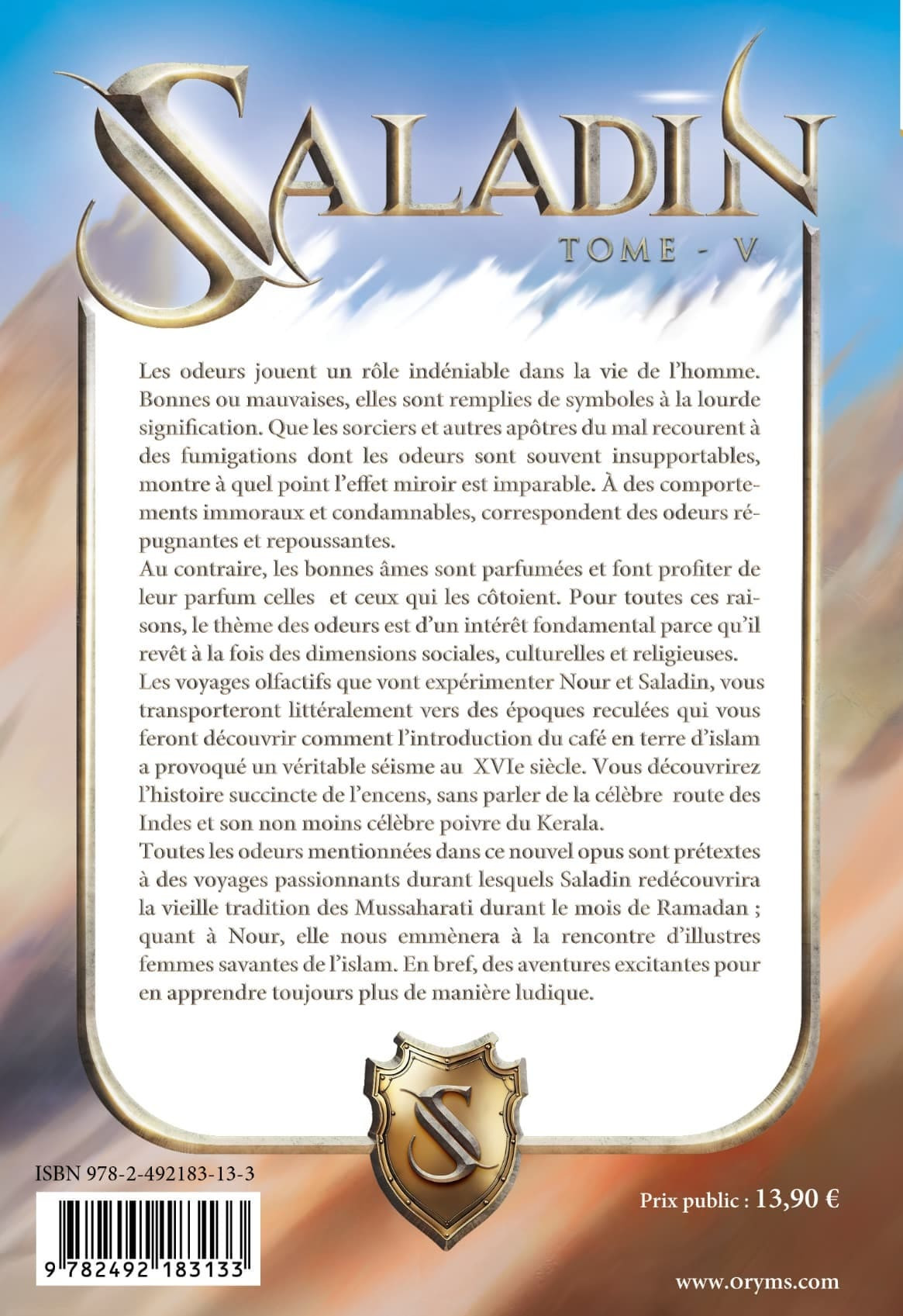 Les odeurs jouent un rôle indéniable dans la vie de l’homme. Bonnes ou mauvaises, elles sont remplies de symboles à la lourde signification. Que les sorciers et autres apôtres du mal recourent à des fumigations dont les odeurs sont souvent insupportables, montre à quel point l’effet miroir est imparable. À des comportements immoraux et condamnables, correspondent des odeurs répugnantes et repoussantes. Au contraire, les bonnes âmes sont parfumées et font profiter de leur parfum celles et ceux qui les côtoient. Pour toutes ces raisons, le thème des odeurs est d’un intérêt fondamental parce qu’il revêt à la fois des dimensions sociales, culturelles et religieuses. Les voyages olfactifs que vont expérimenter Nour et Saladin, vous transporteront littéralement vers des époques reculées qui vous feront découvrir comment l’introduction du café en terre d’islam a provoqué un véritable séisme au XVIe siècle. Vous découvrirez l’histoire succincte de l’encens, sans parler de la célèbre route des Indes et son non moins célèbre poivre du Kerala. Toutes les odeurs mentionnées dans ce nouvel opus sont prétextes à des voyages passionnants durant lesquels Saladin redécouvrira la vieille tradition des Mussaharati durant le mois de Ramadan ; quant à Nour, elle nous emmènera à la rencontre d’illustres femmes savantes de l’islam. En bref, des aventures excitantes pour en apprendre toujours plus de manière ludique.